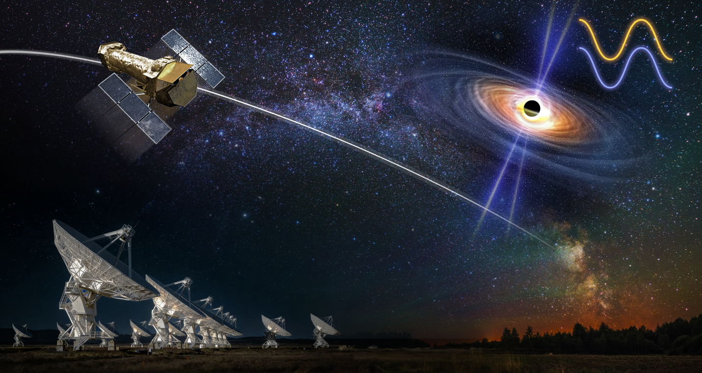 Artist’s impression of disk-jet co-precession in a black hole system (Credit: Xu Zhang). Space-based X-ray telescopes detect high-energy radiation from the innermost regions of the accretion disk, while ground-based radio arrays capture the radio signals emitted by the jet.