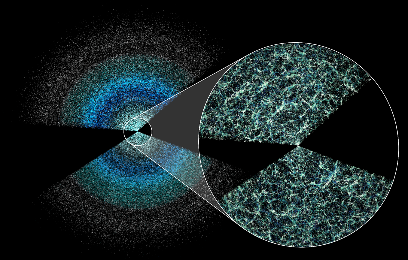 Figure 2. A slice of the universe 3D map from the DESI five-year survey, showing the spatial distribution of galaxies and quasars above and below the plane of the Milky Way. The magnified inset reveals the large-scale structure of the universe. Light from the farthest galaxies shown has traveled for 11 billion years to reach Earth. Credit: DESI collaboration.